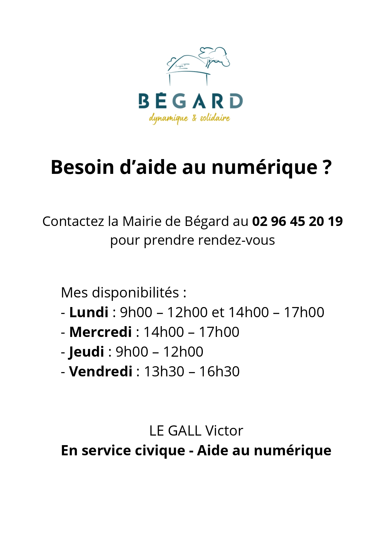 Victor Le Gall, en service civique, est assistant administratif en numérique et peut vous accompagner pour prendre en main les outils numériques. n’hésitez pas à prendre contact avec Xavier Gontier à la mairie de Bégard pour une prise de rendez vous.